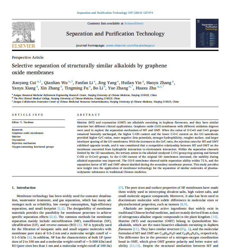 Selective separation of structurally similar alkaloids by graphene oxide membranes